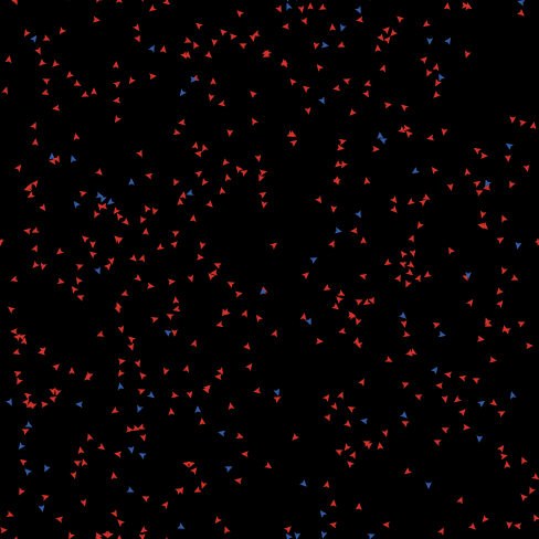 turtles-own [ message? ;; true or false: has this turtle gotten the message yet? ] to setup clear-all crt 500 [ set message? false setxy random-xcor random-ycor ] ask one-of turtles [ set message? true ] ;; give the message to one of the turtles ask turtles [ recolor ] reset-ticks end to go ask turtles [ move ] ask turtles [ communicate ] ask turtles [ recolor ] tick end ;; move randomly to move ;; turtle procedure fd random 4 ;; turn a random amount between -40 and 40 degrees, ;; keeping the average turn at 0 rt random 40 lt random 40 end ;; the core procedure! to communicate ;; turtle procedure if any? other turtles-here with [message?] [ set message? true ] end ; color turtles with message red, and those without message blue to recolor ;; turtle procedure ifelse message? [ set color red ] [ set color blue ] end ; Public Domain: ; To the extent possible under law, Uri Wilensky has waived all ; copyright and related or neighboring rights to this model.