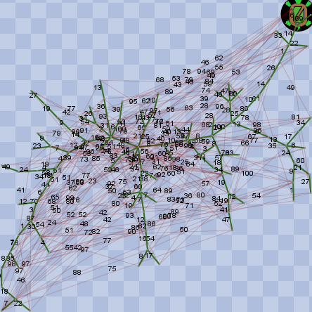 Press RESET (this is done automatically when the model first loads) to generate a random network graph. Then graph is constructed using a method that guarantees the network will be one giant component, with a fair number of loops and such. Each edge in the graph is assigned a random weight in the range 1 to 100.