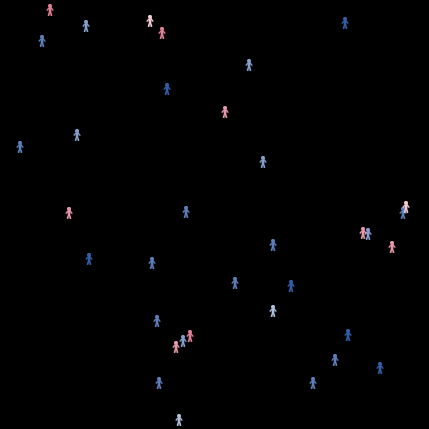 The differences in the age of the population is represented by the colors of individuals. There are 4 colors used for each males and females. The older the male, the darker their tint of blue is. Freshmen thus are lightest blue and seniors the darkest. The same idea applies for females in respect to pink. The darker the pink, the older the female and the lighter the pink the younger she is. Freshmen females thus are the lightest pink and Seniors are depicted as dark pink. Red indicates that a female has been assaulted.