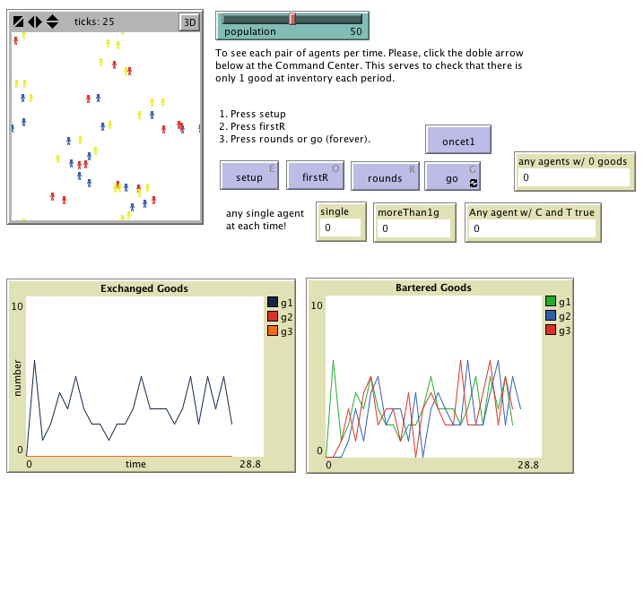 In this enviroment, there three goods (g1, g2 ,g3) and a population of agents of three types: i) agent type I (yellow color) consumes good g1 and produces good g2; ii) agent type II(blue color) consumes g2 and produces good g3; and iii) agent type III(red color) consumes good g3 and produces good g1. Thus, trade is induced by consumption preferences and specialized production. Only one good can be stored from period to period, a no agent can hold more than one good at a time. Agents move randomly to search for partners, each of them can only have one partner per tick. Every agent, also, produces its especialized production good. Once matched every pair of agents can barter if there is full coincide of preferences and production; or one of the agents will become a middleman who takes one of the goods not for consumption but for exchange; and finally nothin can happen if none of the two previuos cases occur. Contrary to the original model, here agents are not maximizing on a rational basis to achieve this equilibrium. Thus, this parsimoniuos model shows that rationality assumption are not necessary to get the fundamental result of the original paper.