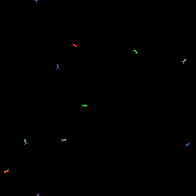 breed [leaders leader] breed [followers follower] to setup clear-all set-default-shape followers "bug" set-default-shape leaders "circle" create-followers 10 ask followers [ setxy random-xcor random-ycor ] ;; the leader breed contains one turtle that is used to represent ;; a leader of the bugs (a circle) create-leaders 1 [ set shape "circle" set color white set size 1.5 hide-turtle ] reset-ticks end to go move-followers move-leader tick end to move-followers ;; followers will face toward the leader, then move forward ask followers ;; with a slight random wiggle [ if not [hidden?] of leader 10 ;; checks to make sure the leader is visible [face leader 10] ;; the leader is the 11th turtle created, so it has "who" # 10 ;; (the followers have "who" #'s 0-9). This checks to see if the leader ;; is present in the view fd .5 ;; forward 1 step rt random 10 ;; turn right lt random 10 ;; turn left ] end to move-leader ;; this code makes the leader appear at the same position as the cursor ask leaders ;; when the cursor is not inside the world, the leader is hidden [ setxy mouse-xcor mouse-ycor ;; only show the leader if the mouse pointer is ;; actually inside the view set hidden? not mouse-inside? ;; "mouse-inside?" checks to see if the mouse is inside the world view ;; when the mouse is outside the world view window, ;; the leader is toggled to hidden ] end