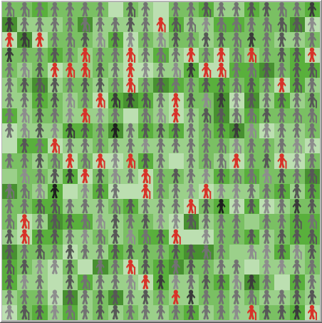 Each patch has a random amount of income (employment income, investment income, etc.). If a randomly assigned income level is negative, it is set to 0. The patches are shaded green in quintiles, with the highest income quintile having the darkest shade of green. This is done once during setup since patch income does not change.