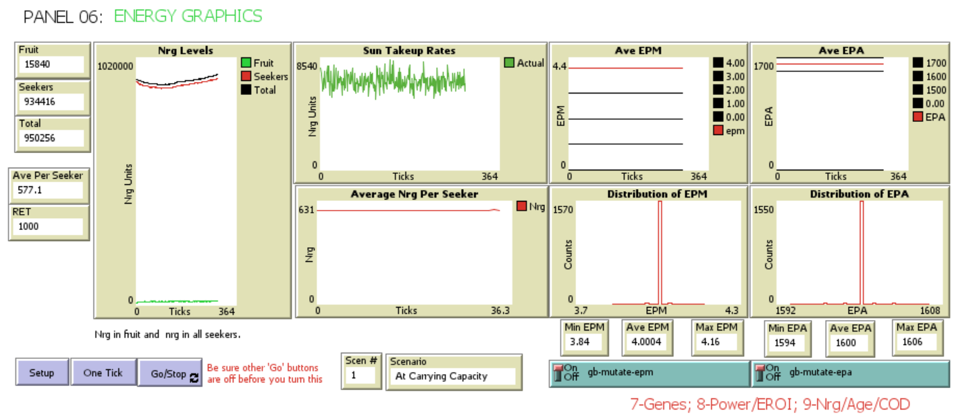 • [c2-epa-parm] - Energy Per Agent - Seekers cannot harvest fruit that will cause the nrg level to exceed this amount. (This gene mutatesin this model, to enable the demonstration of Jevon's paradox.)