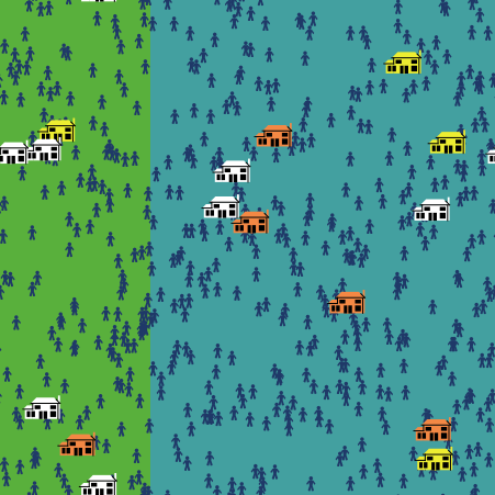 breed [persons person] breed [universities university] persons-own [target familyincome enrolled?] universities-own [highreputation? reputation enrolledstudents] ; reset button to setup clear-all setup-patch setup-university setup-person reset-ticks end ; setup the patch colors to city and urban areas to setup-patch ask patches with [pxcor < -6 AND pycor >= -16] [ set pcolor green ] ask patches with [pxcor >= -6 AND pycor <= 16] [ set pcolor cyan - 1 ] end ; set up the universities based on reputation - it has different colors based on reputation to setup-university create-universities number-of-universities [fd max-pxcor setxy random-xcor random-ycor] ; set the universities shape and default color ask universities [ set shape "house two story" set size 2.6 set color white ; high reputation with white color, moderate reputation with yellow and low reputation with orange ; reputation is based on rank of 30 university - low rank means high reputation and vice versa set reputation random 100 * university-rank / 100 if (reputation >= 0 and reputation < 10 ) [set highreputation? true] ifelse (reputation >= 10 and reputation < 19) [set highreputation? true set color yellow][ ifelse (reputation >= 19) [set highreputation? false set color orange + 1 ][set highreputation? true]] set enrolledstudents 0] end ; setup students color and shape and the target to setup-person create-persons number-of-students [setxy random-xcor random-ycor set shape "person" set size 1 set familyincome one-of (range 500 6000) set color blue - 2 set target 1 set target one-of universities face target ] reset-ticks end ; movement of students between universities to select their target based on distance as well to move-students ask persons [ if distance target = 0 [ set target one-of universities face target ] ifelse distance target < 1 [ move-to target ] [ fd 1 ] ] end ; pick the target university based on family income, rank and distance, the university will be selected. to select-university ifelse (familyincome > income-level and color = white ) [ set target one-of universities with [[familyincome] of myself] with-max [reputation] ] [ ifelse (familyincome < income-level and color = yellow) [ set target min-one-of universities with [[familyincome] of myself - (distance myself) / 100 > 0] with-max [reputation] [distance myself]] [ifelse (familyincome < income-level and color = brown) [set target min-one-of universities with [[familyincome] of myself - (distance myself) / 100 > 0] with-min [reputation] [distance myself]] [set target min-one-of universities with [[familyincome] of myself - (distance myself) / 100 > 0] [distance myself] ] ]] if target != nobody [ move-students] set enrolled? TRUE end ; run the model by calling select university and move students to target to go ask persons [ select-university move-students] ask universities [ calculate-enrolledstudents ] tick if (ticks = 50) [stop] end ; proc to calculate the count of enrolled students to calculate-enrolledstudents if (enrolledstudents < number-of-students) [set enrolledstudents enrolledstudents + 1] end