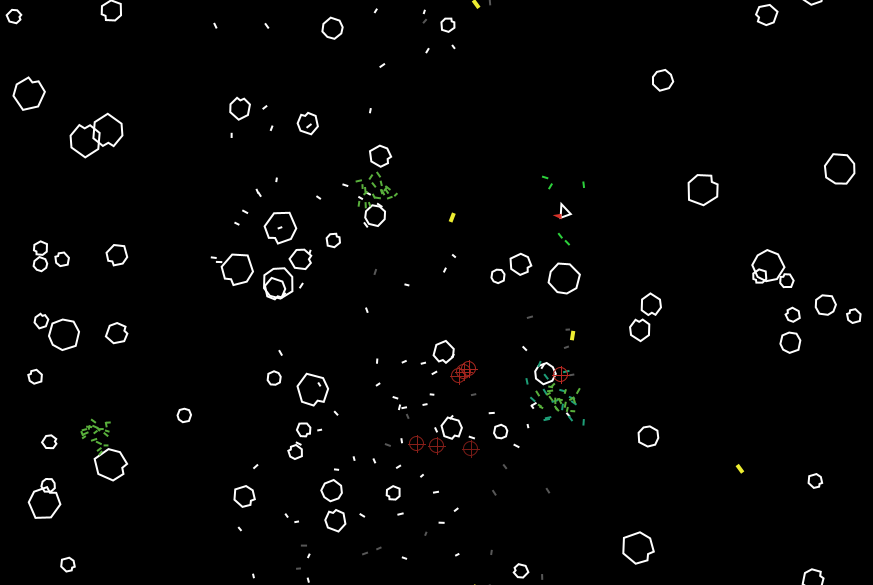 ; extensions [ sound ] globals [ pixel keypress the-ship the-reticule click num-rocks active-reticule score credits reset-pressed rock-color setup-finished rock-info ] patches-own [ rr gg bb ] breed [ rocks rock ] breed [ ships ship ] breed [ bullets bullet ] breed [ fragments fragment ] breed [ messengers messenger ] breed [ reticules reticule ] breed [ letters letter ] breed [ clocks clock ] breed [ HS-effects hs-effect ] clocks-own [ current-time elapsed-time start-time cumulative-time pause-until clock-on ] letters-own [ base-size base-color base-xcor base-heading ] reticules-own [ timeout ] hs-effects-own [ effect-direction ] ships-own [ vx vy vv ax ay av gun-temp gun-limit gun-cooldown max-temp bullet-speed; bullet-burnout max-burnout ] rocks-own [ rock-type vx vy vv av exploding ] bullets-own [ vx vy vv bullet-burnout bullet-speed max-burnout seeker? target-rock ] fragments-own [ vv vx vy av burnout max-burnout kind ] messengers-own [ text ;; the message to ;display caret ;; position within the text cursor ;; patch offset of the caret window ;; the set of patches under the message window# ;; the line on which to ;display the message show-cursor? ;; show the simulated blinking curtor ] to ? [ thing ] ( ifelse ( is-list? thing ) [ output-print " [ " foreach thing [ ?? -> ? ?? ] output-print " ] " ] [ output-print thing ] ) end to-report plus-or-minus [ value ] report value * ( random 2 * 2 - 1 ) end to x_set-line-thickness [ width ] ;; __set-line-thickness width end to setup-rock let rock-start-size 1.5 ^ 5 let rock-start-av .1 + random-float 0.75 let rock-start-v .1 + random-float .1 set rock-info [ [ "rock-1" 0 1 22 ] [ "rock-2" 0 1 22 ] [ "rock-3" 0 1 22 ] [ "rock-4" 0 1 22 ] [ "rock-5" 1 2 12 ] ] create-rocks 1 [ home x_set-line-thickness pixel * 2 let side plus-or-minus 1 let startx side * ( max-pxcor - random ( world-width / 4 ) ) let starty random-ycor setxy startx starty let endx side * ( max-pxcor - random ( world-width / 4 ) ) set heading towardsxy endx plus-or-minus max-pycor set vx dx * rock-start-v set vy dy * rock-start-v set av rock-start-av set color white set rock-type item ( roulette rock-info 3 ) rock-info set shape item 0 rock-type set size rock-start-size / item 2 rock-type ] end to-report roulette [ $layout $bias-index ] ;; the layout are the values being selected from ;; the canoes are widths of each pocket the tendency of each value to be selected let canoes map [ $bias -> item $bias-index $bias ] $layout let total sum canoes let fall random-float total let pocket 0 ;; intial value of canoe = inside the first pocket let canoe item pocket canoes while [ fall > canoe ] [ set pocket pocket + 1 set canoe canoe + item pocket canoes ] report pocket end to rock-explode ;; sound:play-note-later delay instrument keynumber velocity duration sfx "explode-rock" size set heading atan vx vy set vv sqrt ( vx * vx + vy * vy ) if ( size > 4 ) [ set size size * 2 / 3 if vv < .9 [ set vv vv * 1.1 ] let a -1 repeat (1 + random 2) [ hatch 1 [ rt 90 * a set a a + 2 set vx dx * vv set vy dy * vv jump size / 2 set shape one-of [ "rock-1" "rock-2" "rock-2" ] x_set-line-thickness pixel * 2 ] ] ] fragment-setup white 0 size die end to fragment-setup [ hue direction radius ] let xx xcor let yy ycor let $extra max list 0 (count fragments - 100) ask n-of $extra fragments [ die ] hatch-fragments ifelse-value ( direction = 0 ) [ 5 ] [ 1 ] [ set color hue set heading random 360 x_set-line-thickness pixel * 2 set vv .1 + random-float .2 set vx dx * vv set vy dy * vv set max-burnout 40 ifelse direction != 0 [ jump 2 rt 180 set size 2 set av 0 ] [ jump ( .5 * random-float radius ) rt 90 set size ( size + random-float 2 ) set av 20 * ( random 2 * 2 - 1 ) ] ] end to game-clear ;; setup a game clear-drawing clear-patches clear-turtles clear-links set num-rocks 0 end to ship-setup create-ships 1 [ set color magenta + 2 set heading 0 set shape "_ship-000" x_set-line-thickness pixel * 2 set size 2 set bullet-speed 1 set bullet-burnout max-pxcor / bullet-speed set max-burnout bullet-burnout set gun-limit 5 set gun-temp 0 set max-temp 4 / bullet-speed ;; floor ( 30 / 2 / pixel ) set the-ship self ] inspect the-ship end to reticule-setup ask patch min-pxcor min-pycor [ sprout-reticules 1 [ hide-turtle setxy max-pxcor max-pycor set heading 0 set shape "reticule" set color red x_set-line-thickness pixel * 3 set size 2 set active-reticule self set timeout 0 ] ] end to reticules-go if self != active-reticule [ if timeout = 0 [ set timeout timer + 2 ] ifelse timer < timeout [ set color scale-color red ( timeout - timer ) -3 8 ] [ die ] ] end to ship-explode sfx "ship-explode" 0 die end to-report ship-fire ;; SETUP-bullet let fire! false ask the-ship [ if gun-temp <= 0 and count bullets < gun-limit [ sfx "pew" 0 hatch-bullets 1 [ x_set-line-thickness pixel * 4 set size max list .5 ( pixel * 3 ) set color white set vx dx * ( bullet-speed ) set vy dy * ( bullet-speed ) jump .5 set fire! true set seeker? false let vary random 100 ( ifelse ( vary > 90 ) ;; hunter missle [ set seeker? true set size .5 set shape "missle" set target-rock one-of rocks set color yellow set bullet-burnout 200 ] ( vary > 80 ) ;; triple shot [ hatch 1 [ rt 90 jump .5 lt 90 ] hatch 1 [ lt 90 jump .5 rt 90 ] ] ( vary > 70 ) ;; to left, right, and center [ hatch 1 [ rt 90 ] hatch 1 [ lt 90 ] ] ( vary > 60 ) ;; four-way shot [ hatch 1 [ rt 90 ] hatch 1 [ lt 90 ] hatch 1 [ rt 180 jump 1 ] ] ( vary > 55 ) ;; circle of pebbles [ let a heading setxy [ xcor ] of myself [ ycor ] of myself repeat ( 360 / 5 ) [ hatch 1 [ rt a jump .5 ] set a a + 5 ] jump .5 ] ;; no specialization [ ] ) ] set gun-temp max-temp ] ] report fire! end to rock-go ; if count rocks < 5 and any? ships ; [ ; let hh towards one-of ships ; set vx .5 * sin hh ; set vy .5 * cos hh ; ] set vv ( vx * vx + vy * vy ) ifelse ( vv > 1 ) [ rock-explode ] [ let trail-color red + 10 * int min list 120 ( 10 * size ) setxy ( xcor + vx ) ( ycor + vy ) rt av ask patches in-radius (round (.3 *