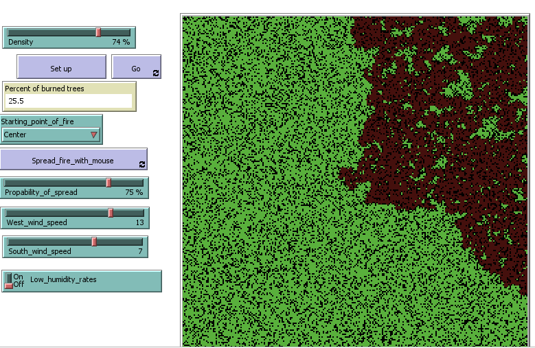 The fire could start from the leFt side or the center of the forest. There is also the possibility to spread the starting points of the fire with the mouse. The fire spreads in four directions: north, east, south, and west.