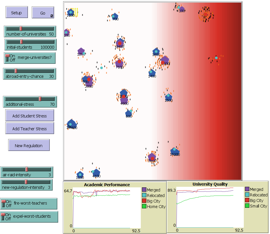 ;extensions [csv] globals [ frontline-xcor ; X coordinate of the frontline city-centers ; List of city center patches war-intensity ; Overall war intensity affecting infrastructure air-raid-probability ; Probability of air raid per tick missile-attack-recovery-counter teacher-batch-size ; Size of teacjer batches (currently 20) student-batch-size ; Size of student batches (currently 100) student-total-attempts ; Total attempts a student can make across all tiers student-attempts-per-tier ; Maximum attempts per university tier air-raid? last-air-raid-tick ; When the last air raid occurred air-raid-recovery-counter ; Counter for recovery period air-raid-recovery-time ; how many ticks recovery takes ; Teacher tracking metrics teachers-initially-assigned ; Count of successful initial assignments teachers-quit ; Count of teachers who quit due to stress teachers-fired ; Count of teachers laid off due to capacity/performance teachers-rehired ; Count of unemployed teachers who found new positions ] breed [students student] breed [teachers teacher] breed [universities university] breed [cities city] patches-own [ local-war-intensity ; Local war intensity for this area ] students-own [ male? ; Gender (relevant for conscription) age ; Student's age propensity-to-study ; Natural desire to study regardless of circumstances (0-100) desire-to-study ; Motivation to study (0-100) studying? ; Whether actively studying abroad? ; Whether studying abroad program-type ; "bachelor", "master" or "phd" my-university ; The university this student attends previous-university last-application-attempt ; Tick when last attempted to enter remaining-attempts ; How many attempts they still have academic-skill ; Student's academic ability (0-100) baseline-academic-skill ; Natural academic ability before stress effects current-academic-performance ; Actual current performance (0-100) affected by stress conscription-fear ; How much they fear conscription (0-100) stress-level ; Individual stress level (0-100) stress-resilience ; How well they handle stress (0-100) max-stress-threshold min-stress-for-return ] teachers-own [ my-university ; Current university unemployed? ; Whether currently looking for work teaching-skill ; Individual teaching ability (0-100) baseline-teaching-skill stress-level ; Individual stress level (0-100) adaptation-rate ; How quickly they adapt to new stress caused by warfare of regulations ] universities-own [ ;; Capacity location-type ; "home-city" or "big-city" capacity ; How many students can enroll enrolled-students-count ; Current number of enrolled students current-teachers ; Current number of teachers teachers-needed ; How many teachers needed based on capacity ;; Quality quality ; Education quality rating (0-100) entry-barrier ; How difficult it is to enter (0-100) distance-from-front ; Distance from the front line local-risk ; Local war risk based on location infrastructure-damage ; Damage level from attacks (0-100) faculty-stress-level ; Stress level of faculty at this university (0-100) bureaucratic-load ; Bureaucratic load at this university (0-100) online-mode? ; Whether currently teaching online is-merged? ; Whether university has been merged relocated? ] cities-own [ city-type ; "big-city" or "home-city" ] to setup clear-all setup-globals setup-cities setup-universities setup-patches setup-teachers ask teachers [assign-teacher-to-university] set teachers-initially-assigned teachers-rehired set teachers-rehired 0 initialize-university-quality ; Initializes quality based on teachers setup-students reset-ticks end to setup-globals set air-raid-probability 0.2 ; once per 5 days set war-intensity 0 set frontline-xcor max-pxcor ; Start frontline in right side of map set student-batch-size 100 set teacher-batch-size 20 ; Each teacher agent represents 20 actual teachers set student-total-attempts 15 set student-attempts-per-tier 3 set air-raid? false set last-air-raid-tick 0 set air-raid-recovery-counter 0 set air-raid-recovery-time 15; how many ticks recovery takes set teachers-initially-assigned 0 set teachers-quit 0 set teachers-fired 0 set teachers-rehired 0 end to setup-cities ; Create 20-24 cities let num-cities 20 + random 4 let num-big-cities round (num-cities * 0.3) ; 30% are big cities ; Create big cities first (they need more space) create-cities num-big-cities [ setxy random-xcor random-ycor while [any? other cities in-radius 10] [ setxy random-xcor random-ycor ] set city-type "big-city" set color red set shape "circle" set size 2 ] ; Create remaining home cities create-cities (num-cities - num-big-cities) [ setxy random-xcor random-ycor while [any? other cities in-radius 7] [ setxy random-xcor random-ycor ] set city-type "home-city" set color cyan set shape "circle" set size 1.5 ] end to color-patch ; Base color from war intensity let base-color scale-color red local-war-intensity 100 0 set pcolor base-color end to setup-patches ask patches [ ; Initialize local war intensity based on distance from frontline set local-war-intensity 0 color-patch ] end to go update-war-intensity check-critical-events batch-update-universities batch-update-students batch-update-teachers tick end to setup-universities create-universities number-of-universities [ ; First determine if this will be a big-city or home-city university set location-type one-of ["big-city" "home-city"] set relocated? false ; Find appropriate city type to move to let target-cities cities with [city-type = [location-type] of myself] ifelse any? target-cities [ move-to one-of target-cities right random 360 forward random 3 ][ ; Fallback if no matching cities available move-to one-of cities set location-type [city-type] of one-of cities-here ; Adapt to the city type we landed in ] ; Set initial properties based on location type ifelse location-type = "big-city" [ set capacity round (5000 + random 15000) set quality 50 + random 30 ; Initial baseline quality for big cities ][ set capacity round (1000 + random 4000) set quality 30 +