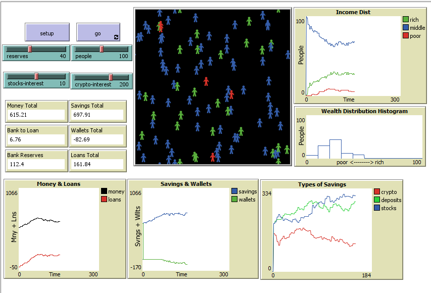 The three monitors on the left of the interface (LOANS-TOTAL, BANK-TO-LOAN and RESERVES) represent the distribution of the bank's money at a given time. Try and track this distribution against SAVINGS-TOTAL, WALLETS-TOTAL and MONEY-TOTAL to understand fluctuations of money in the system as they happen.