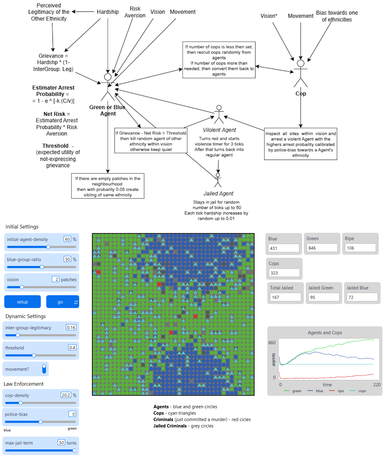 Law Enforcement: Cops move randomly throughout the space and arrest violent agents within their vision. Police bias can be adjusted to favor arresting one ethnic group over another. Arrested agents serve jail terms and are temporarily removed from the population.
